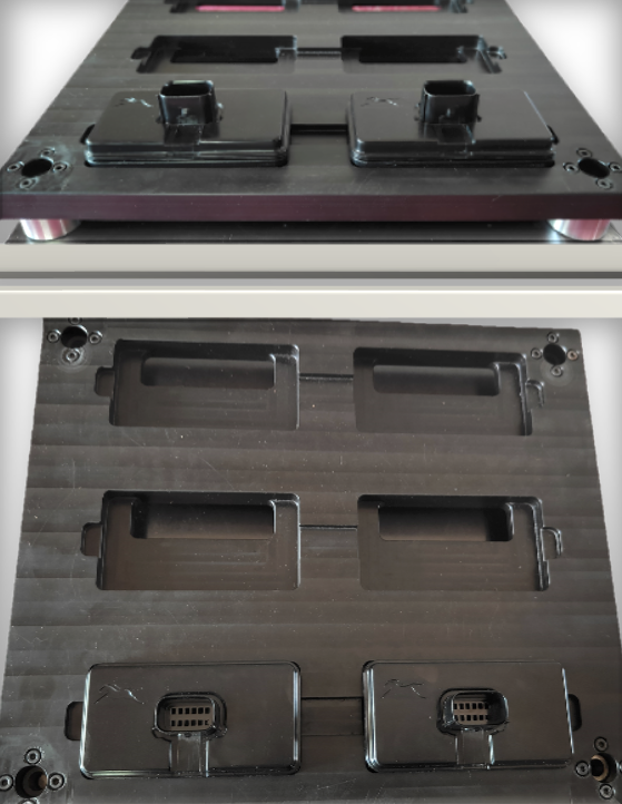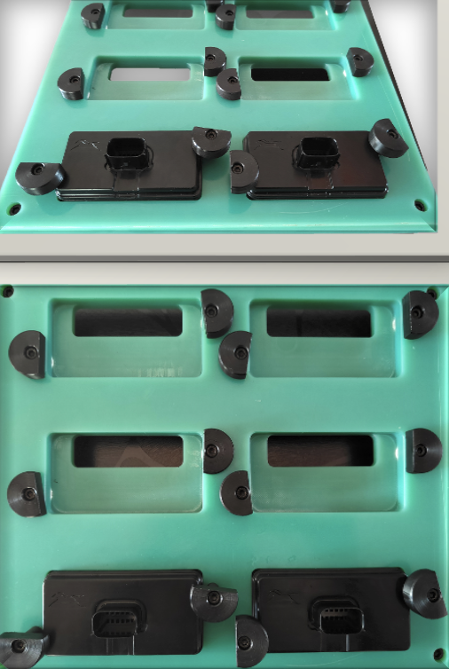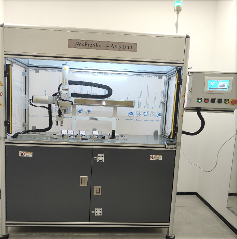 Glue dispensing, forced curing, connector pressing fixtures and robotic automation systems for automotive electronic components.